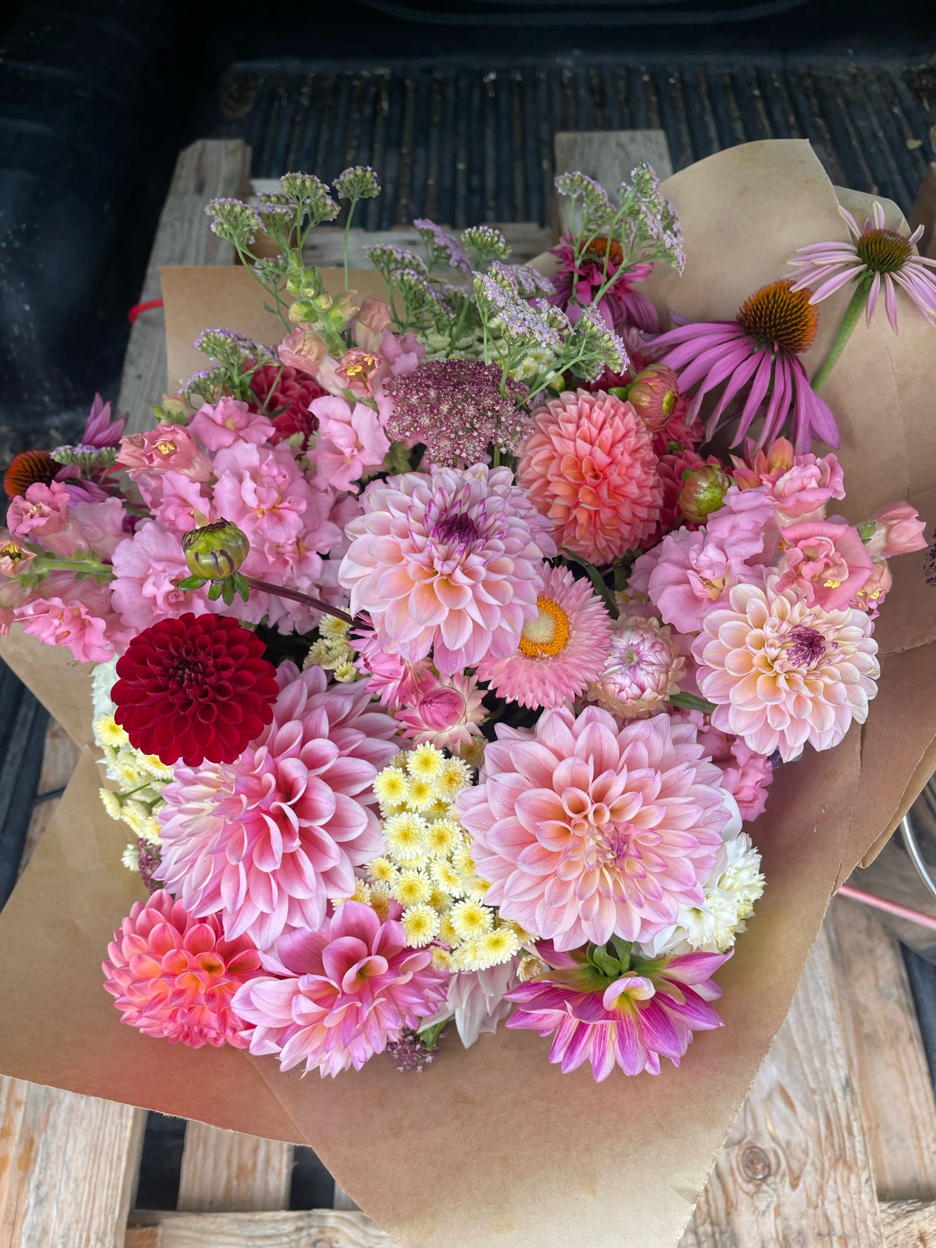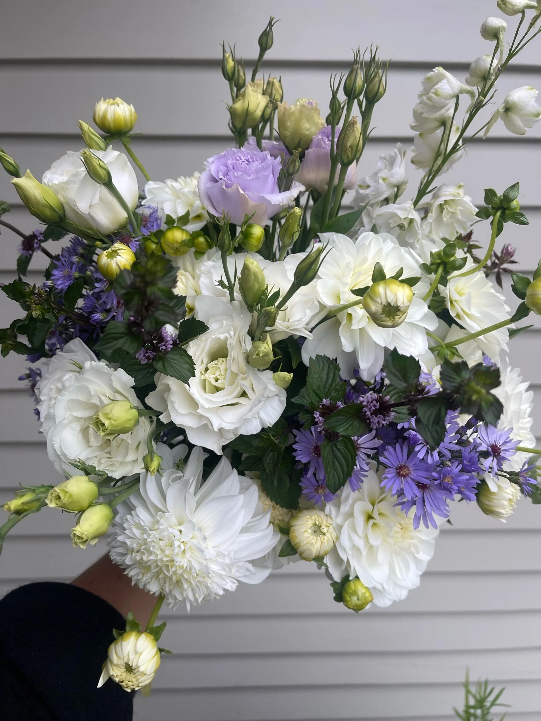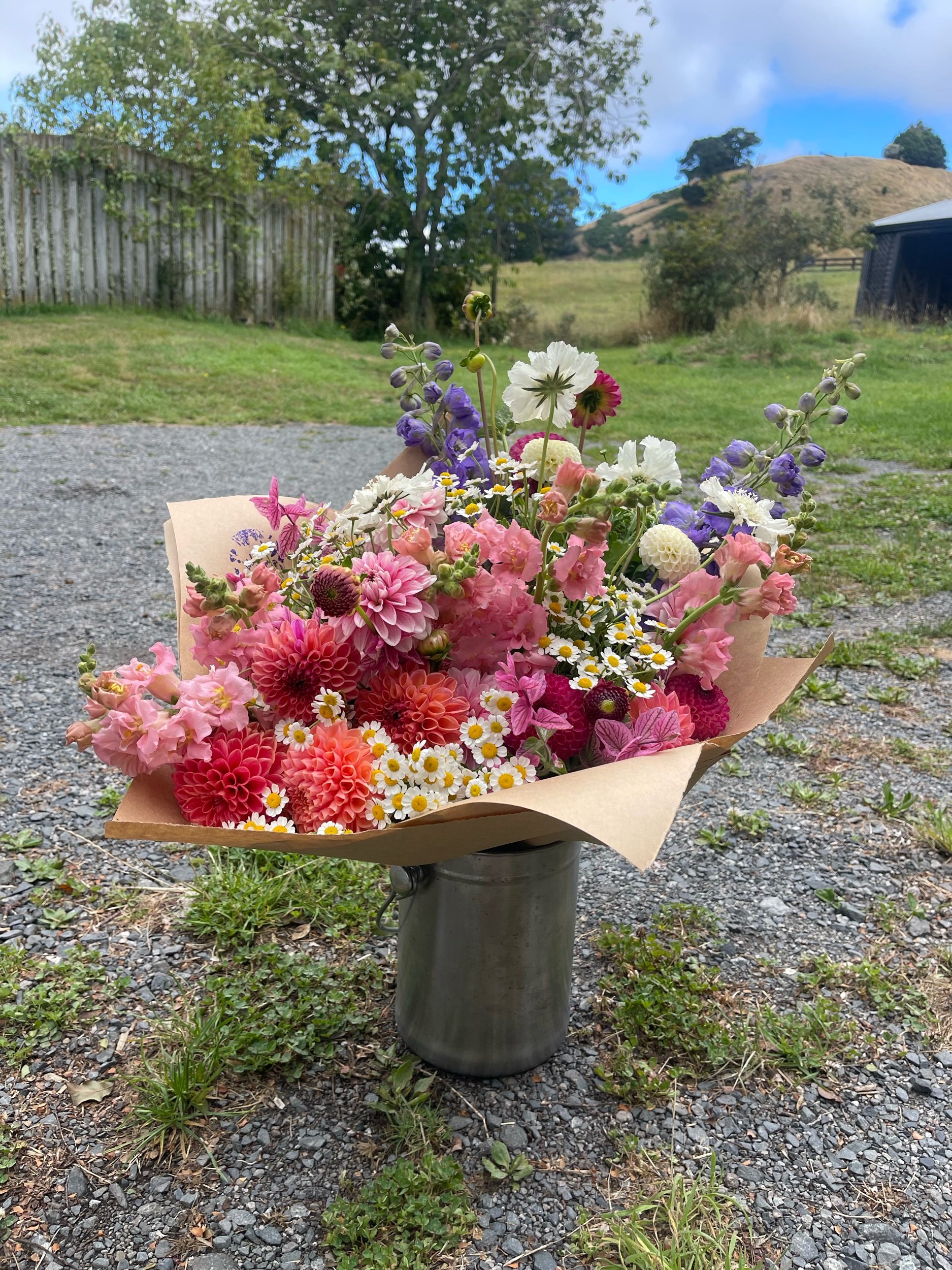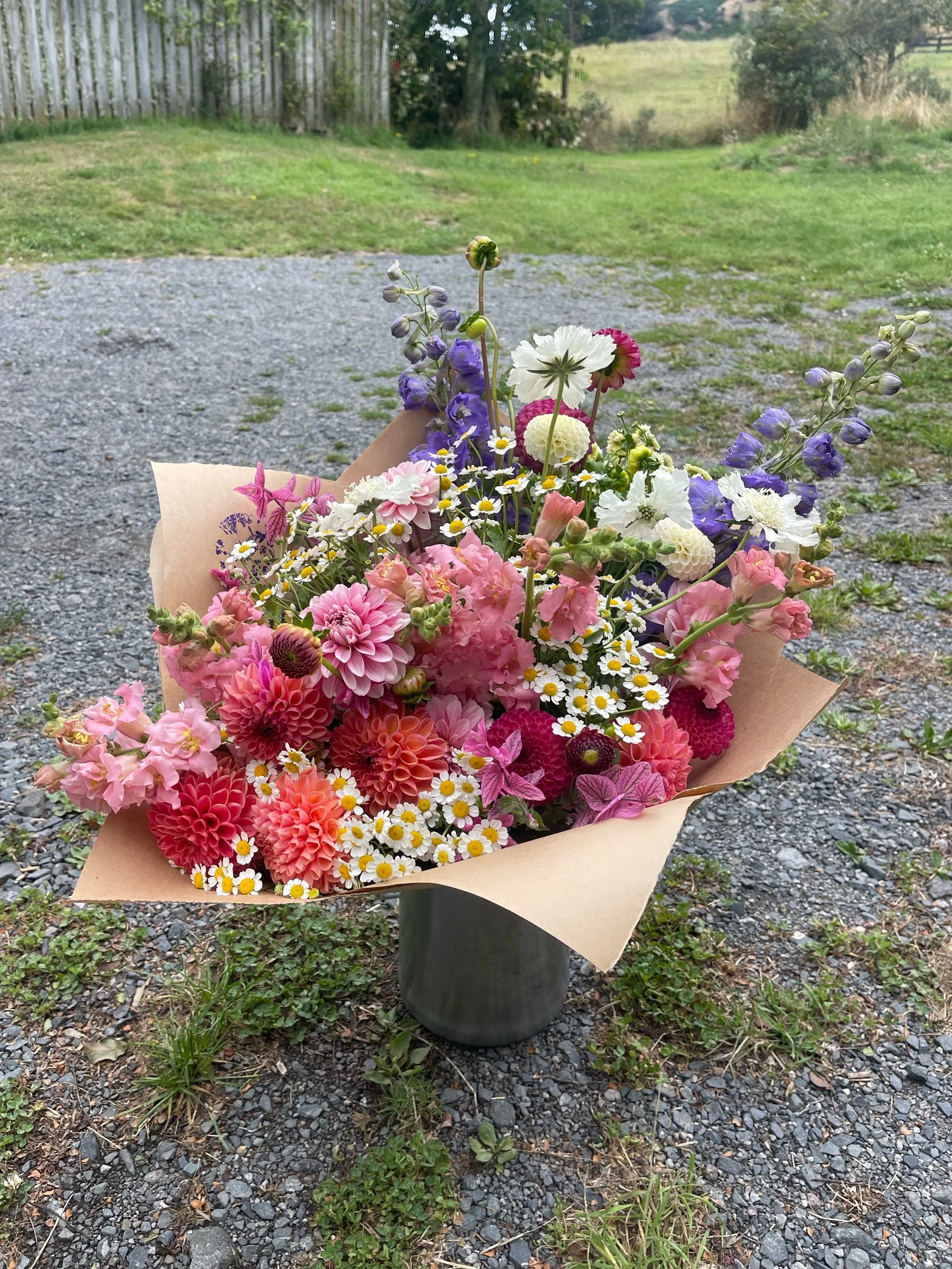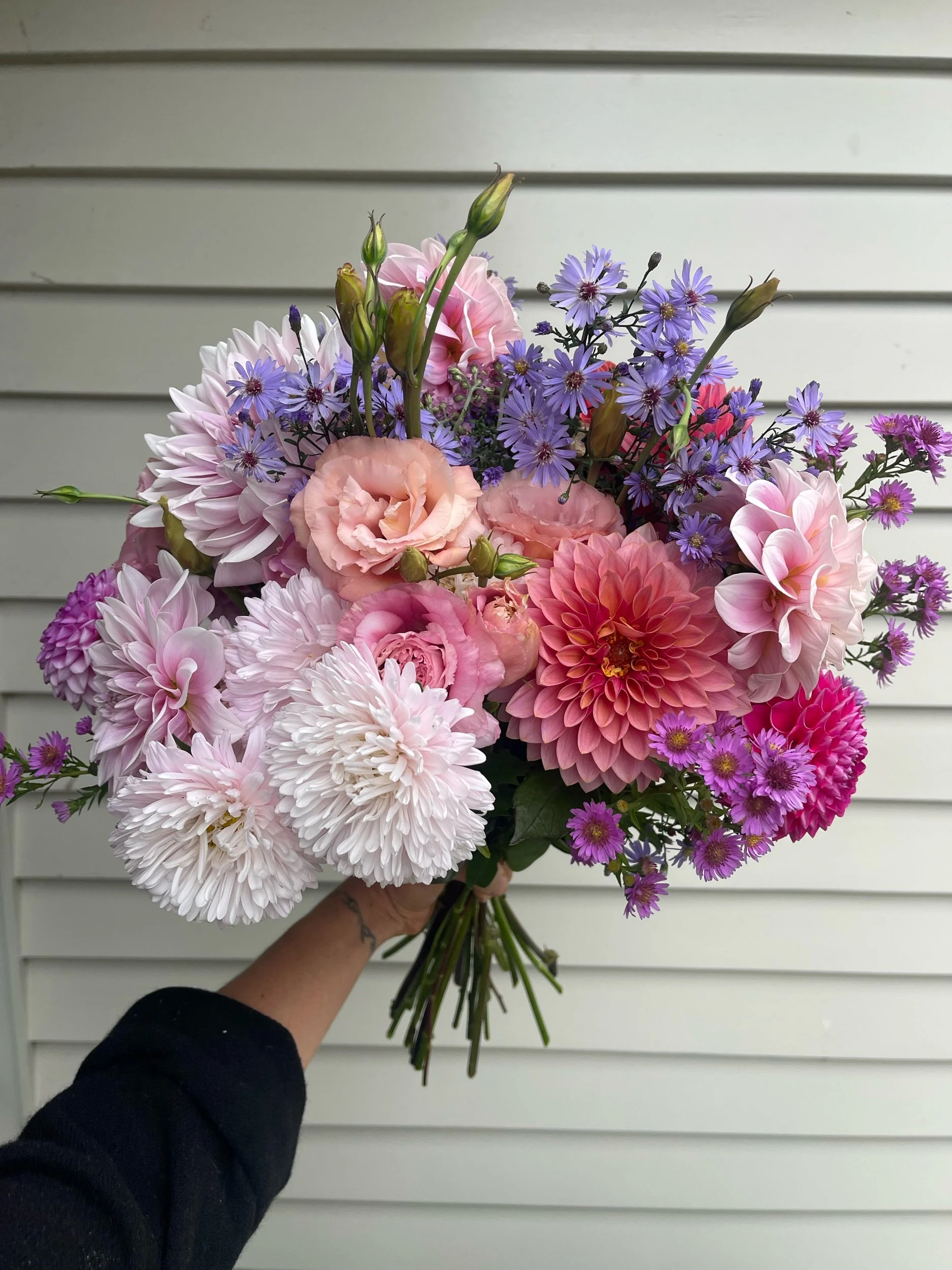 Flower availability changes week to week depending on what is blooming. Colour palette requests are welcome, but not always possible to match perfectly. All flowers selected are growers choice – the best from the field on the day.